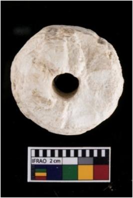 | Description / विवरण | Pendant made of schist. It is reel shaped cylindrical ear spool with perforation and concentric circles on circular ends. |