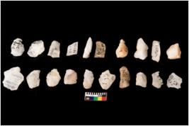 | Description / विवरण | Specimen of flakes tool with prominent flaking marks. It made up of a short flakes with sides trimmed. |