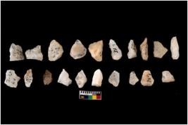 | Description / विवरण | Specimen of flakes tool with prominent flaking marks. It made up of a short flakes with sides trimmed. |