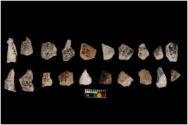 | Description / विवरण | Specimen of flake tool with prominent flaking marks. It made up of a short flakes with sides trimmed. |