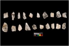 | Description / विवरण | Specimen of flake tool with prominent flaking marks. It made up of a short flakes with sides trimmed. |