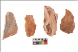 | Description / विवरण | Four worked flakes, some are uneven whereas some are tapering at one end. Most of them are having sharp edges. |