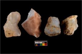 | Description / विवरण | There are n-4 of utilized flake cores. There are multidirectional irregular dominant scar pattern on both dorsal and ventral face of the cores. Some of them bulge of percussion and some are flat flake cores. |