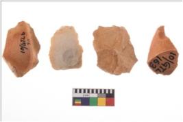 | Description / विवरण | Four worked flakes, some are uneven whereas some are tapering at one end. Most of them are having sharp edges. |