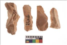 | Description / विवरण | Four worked flakes, some are uneven whereas some are tapering at one end. Most of them are having sharp edges. |