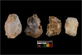 | Description / विवरण | There are n-4 of utilized flake cores. There are multidirectional irregular dominant scar pattern on both dorsal and ventral face of the cores. Some of them bulge of percussion and some are flat flake cores. |