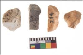 | Description / विवरण | Four worked flakes, some are uneven whereas some are tapering at one end. Most of them are having sharp edges. |