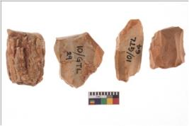 | Description / विवरण | Specimen of fluted cores showing impressions of blades removed from almost all the sides. |