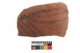 | Description / विवरण | Specimen of black on red ware with decorative geometric set of arches pattern painting. |