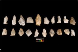 | Description / विवरण | Specimen of flakes tool with prominent flaking marks. It made up of a short flakes with sides trimmed. |