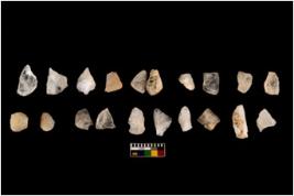 | Description / विवरण | Specimen of flakes tool with prominent flaking marks. It made up of a short flakes with sides trimmed. |