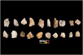 | Description / विवरण | Specimen of flakes tool with prominent flaking marks. It made up of a short flakes with sides trimmed. |