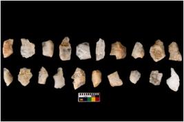 | Description / विवरण | Specimen of flakes tool with prominent flaking marks. It made up of a short flakes with sides trimmed. |