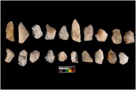 | Description / विवरण | Specimen of flakes tool with prominent flaking marks. It made up of a short flakes with sides trimmed. |