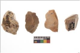 | Description / विवरण | Four worked flakes, some are uneven whereas some are tapering at one end. Most of them are having sharp edges. |