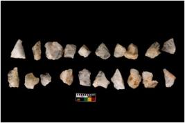 | Description / विवरण | Specimen of flakes tool with prominent flaking marks. It made up of a short flakes with sides trimmed. |