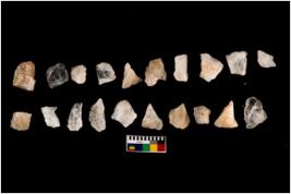 | Description / विवरण | Specimen of flakes tool with prominent flaking marks. It made up of a short flakes with sides trimmed. |