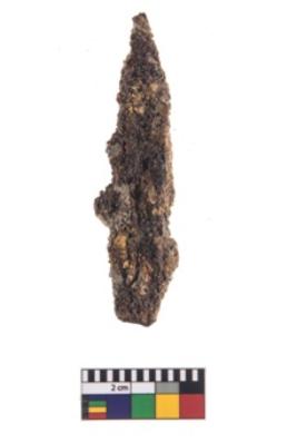 | Description / विवरण | A Partially Broken specimen of iron made arrow head with a broken tang and a square section and blade is four - faced spike like. At present it his heavily rusted |