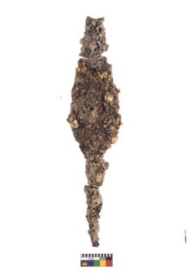 | Description / विवरण | A Partially Broken specimen of iron made spearhead, with tapering pointed broken tip , It is having a tang which is circular in section and fragmentary along with an long socketted end. The entire body of this object is heavily rusted . |