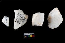 | Description / विवरण | A specimen of a fluted core having very few fluted marks before removing of blades form it. It is roughly rounded in shape and white in colour. |