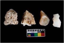 | Description / विवरण | There are n-4 of intact cores. Out of them 2 are made up Chalcedony and 2 are made up of Chert.There are multidirectional irregular dominant scar pattern on both dorsal and ventral face of the cores. |