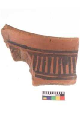 | Description / विवरण | Specimen of potsherd black on red painted pottery. It is fine fabric in sharp contrast with painted design are executed in black pigment. |