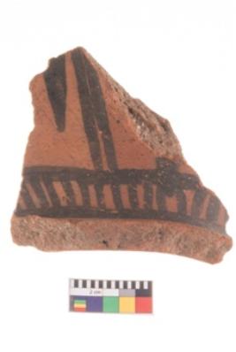 | Description / विवरण | Specimen of potsherd black on red painted pottery. It is fine fabric in sharp contrast with painted design are executed in black pigment. |