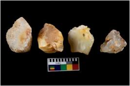 | Description / विवरण | There are n-4 of intact cores made up of Chalcedony.There are multidirectional irregular dominant scar pattern on both dorsal and ventral face of the cores. |