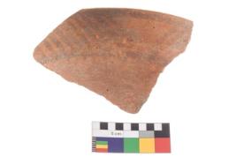 | Description / विवरण | Specimen of potsherd black on red painted pottery. It is fine fabric in sharp contrast with painted design are executed in black pigment. |