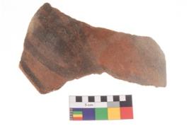 | Description / विवरण | Specimen of potsherd black on red painted pottery. It is fine fabric in sharp contrast with painted design are executed in black pigment. |