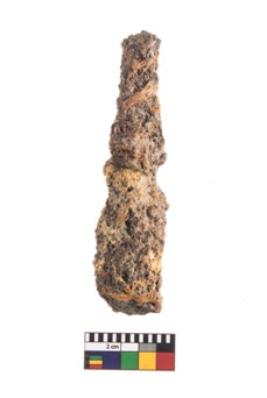 | Description / विवरण | A complete specimen of a nail with flat roughly rectangular body and rounded end. It is heavily rusted. |