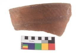 | Description / विवरण | Specimen of potsherd black on red painted pottery. It is fine fabric in sharp contrast with painted design are executed in black pigment. |