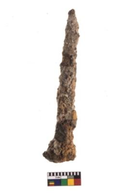 | Description / विवरण | A complete specimen of a nail with rounded head , roughly rectangular tapering body with rounded end. It is heavily rusted. |
