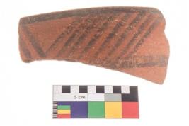 | Description / विवरण | Specimen of a potsherd with black decorative geometric painting. |