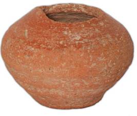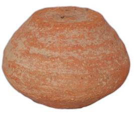 | Description / विवरण | Miniature red ware pot with flat base and broken rim, multiple thickened and broad grooves below the carinated body. |