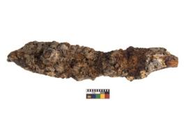 | Description / विवरण | A partially broken specimen of an iron made rectangular shaped knife blade . It is straight sided and ended with a point. It is having a broken tang. Probably used a handle to open door it is heavily rusted . |