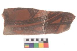 | Description / विवरण | A Specimen of a potsherd with black decorative geometric painting on it. It have group of oblique lines set two horizontal bands. |