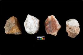| Description / विवरण | There are n-4 of intact cores. Out of them 2 are made up Chalcedony, 1 is made up of Agate and 1 is made up of Chert.There are multidirectional irregular dominant scar pattern on both dorsal and ventral face of the cores. |