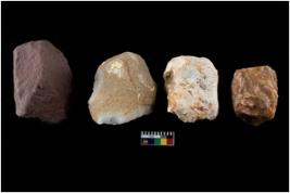 | Description / विवरण | There are n-4 of intact cores. Out of them 1 is made up Chalcedony and 3 are made up of Chert.There are multidirectional irregular dominant scar pattern on both dorsal and ventral face of the cores. |