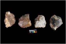 | Description / विवरण | There are n-4 of intact cores. Out of them 1 is made up Chalcedony and 3 are made up of Chert.There are multidirectional irregular dominant scar pattern on both dorsal and ventral face of the cores. |