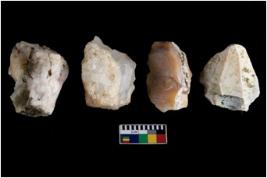 | Description / विवरण | There are n-4 of intact cores. Out of them 1 is made up Chalcedony, 1 is made up of Agate and 2 are made up of Chert.There are multidirectional irregular dominant scar pattern on both dorsal and ventral face of the cores. |