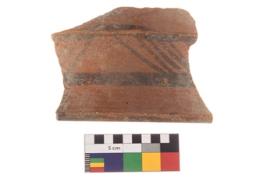 | Description / विवरण | Specimen of potsherd black on red painted pottery. It is fine fabric in sharp contrast with painted design are executed in black pigment. |