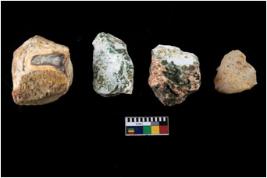 | Description / विवरण | There are n-4 of intact cores. Out of them 1 is made up Chalcedony and 3 are made up of Chert.There are multidirectional irregular dominant scar pattern on both dorsal and ventral face of the cores. |