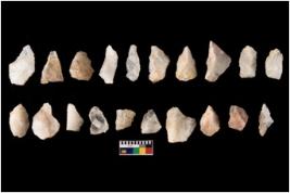 | Description / विवरण | Specimen of flakes tool with prominent flaking marks. It made up of a short flakes with sides trimmed. |