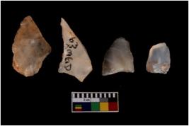 | Description / विवरण | Four worked flakes with sharp edges and few are tapering at one end. |