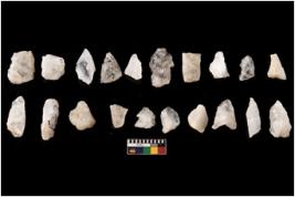 | Description / विवरण | Specimen of flakes tool with prominent flaking marks. It made up of a short flakes with sides trimmed. |