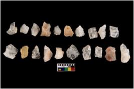 | Description / विवरण | Specimen of flake tool with prominent flaking marks. It made up of a short flakes with sides trimmed. |