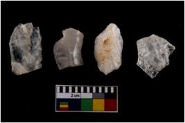 | Description / विवरण | Four worked flakes with sharp edges and few are tapering at one end. |