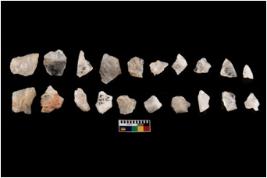 | Description / विवरण | Specimen of flake tool with prominent flaking marks. It made up of a short flakes with sides trimmed. |