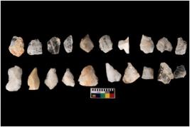 | Description / विवरण | Specimen of flake tool with prominent flaking marks. It made up of a short flakes with sides trimmed. |